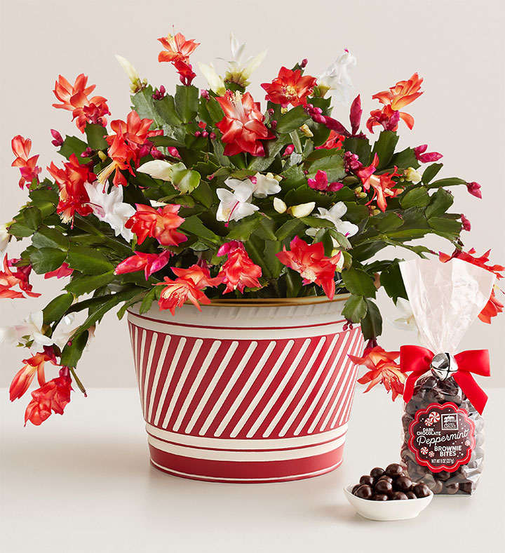 EXCLUSIVE Our Christmas cactus is a favorite for bringing holiday spirit into the home. This long-lasting plant arrives budding and ready to bloom with red-and-white flowers reminiscent of—yes!—candy canes. Designed in a candy-cane-striped planter, it’s a gift full of festive charm. Choose one of two sizes, and make the gift extra sweet with the addition of peppermint brownie bites.